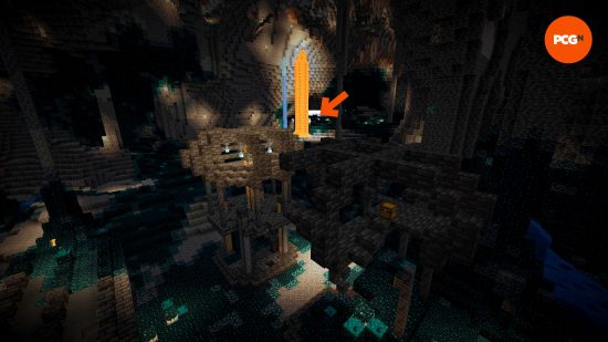 If you weren’t aware, there is a chance you can spawn close to bedrock if there is nothing but air above you and thus the first solid ground at those coordinates are on a low y-level. That’s exactly what happens here as you spawn in on y-level -49 with natural light pouring all the way down to illuminate the Ancient City (and diamonds) around you. Yep, that’s spawn diamonds. Just don’t forget to go quietly if you don’t want to awaken the deadly Minecraft Warden.