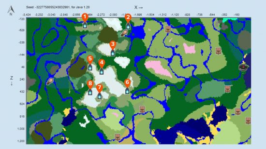 This multiple biome seed doesn’t give you every biome near spawn but offers a great variation of biomes in a relatively small area. As shown on Reddit, you’ll find a small patch of Mesa (x=1,350, z=1,700) to the southeast, surrounded by Plains, Savanna, Forests, Jungle, and Stony Peaks. Even better; both Savanna and Plains Villages surround this location. It’s a perfect place if you’re looking for a varied landscape.