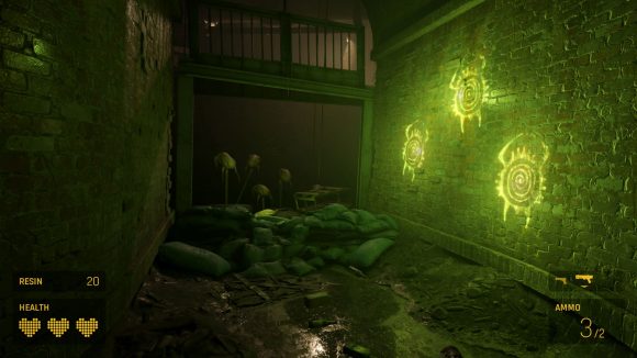 You only get three guns – a pistol, a shotgun, and an assault rifle – but these weapons comprise a smartly limited arsenal that doesn’t actually feel limited at all. Each gun has its place, and the small selection means it’s easy to both quickly switch between them in combat and to make sense of the ammo you’re collecting. You’ll also gather ‘resin’ to upgrade your guns with various attachments, from the pistol’s simple laser sight to an always satisfying grenade launcher for your shotgun. These are major upgrades that make your guns feel even more varied and offer some replay value, since it’s nigh impossible to get them all in a single playthrough.