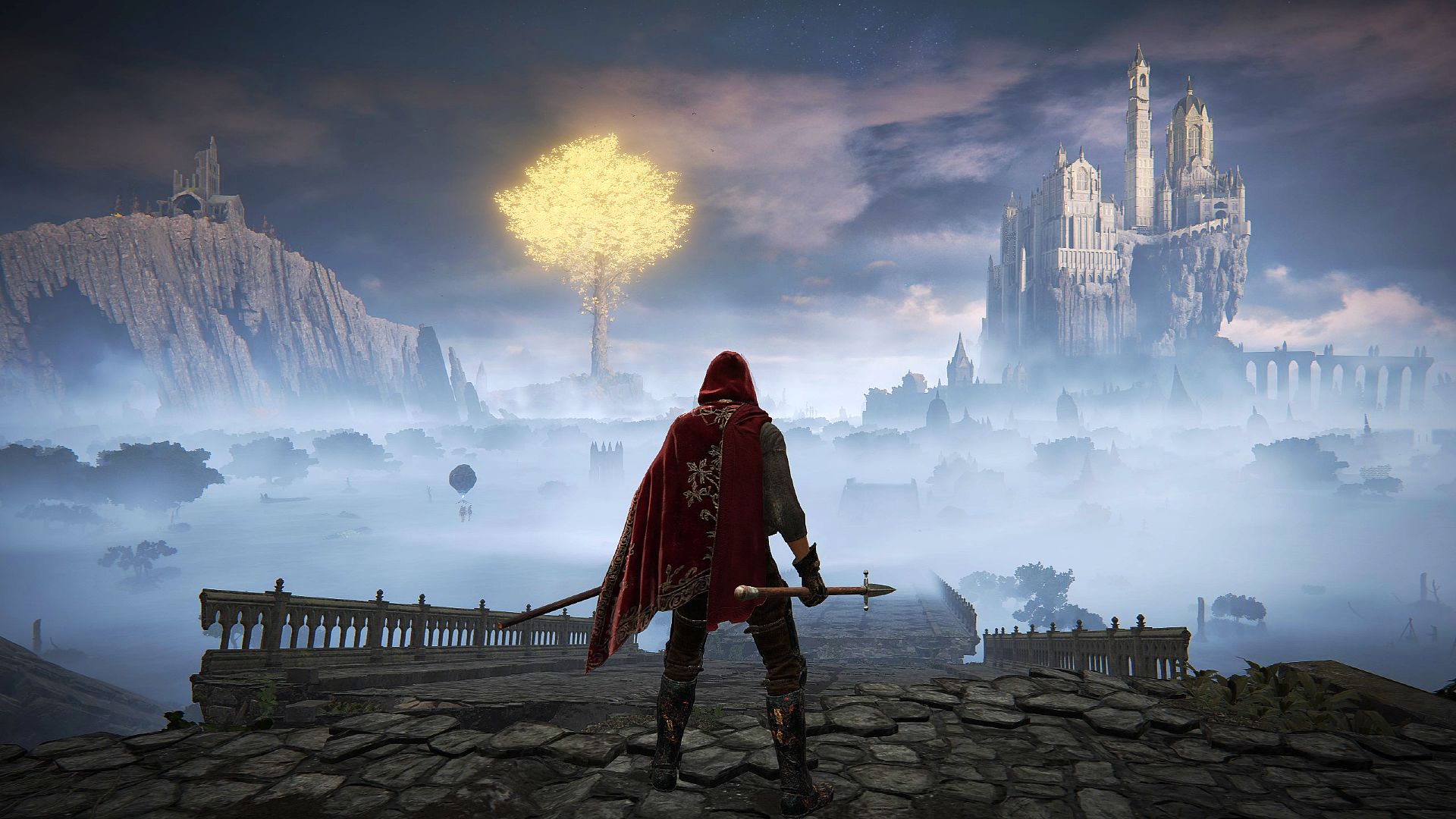 Every new horizon is like a high fantasy painting. You’ll find yourself staring out over a mist-shrouded lake that stretches as far as the eye can see. There’s a glowing erdtree on the horizon, which you can ride to on your spectral steed, Torrent. Flanking the vista are two cliff faces, jutting up from the lake like supersized versions of the Giant’s Causeway – on the right there’s the Academy of Raya Lucaria, a scholarly ivory tower of sorcerers, and on the left there’s a demolished medieval church. You can ride to those places, too.